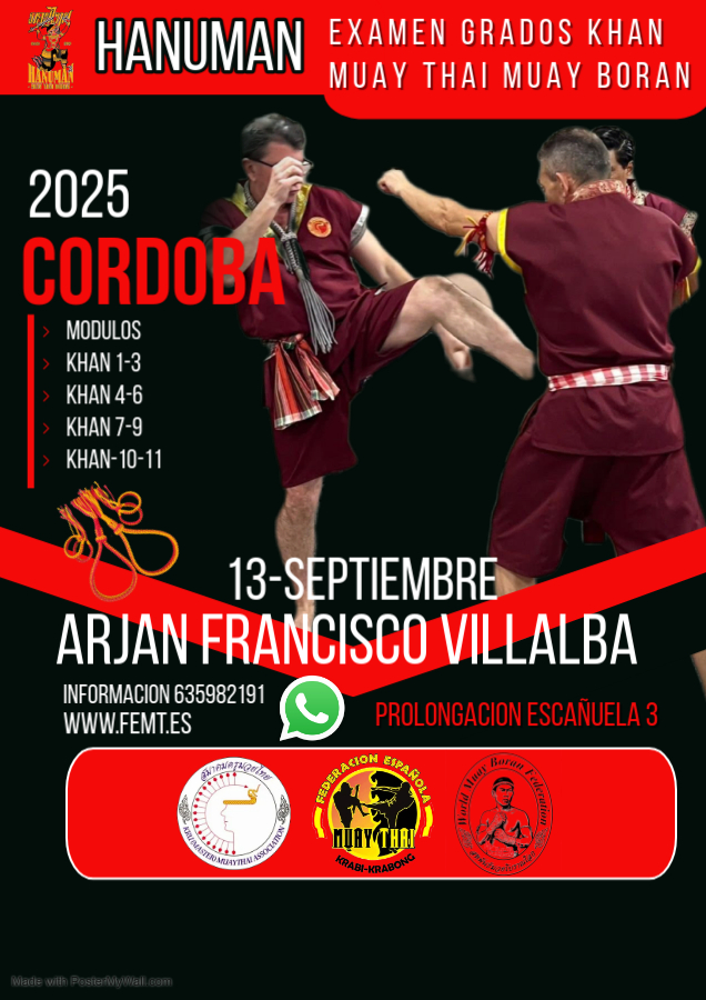 El 4 Junio el club Hanuman de Córdoba, organiza exámenes de grados khan 2022 plazo de inscripción 20 Mayo por motivos de organización. información 635982191 www.hanumanmuaythaiborancordoba.es